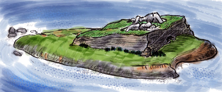 In the high end of the mesa a cave opens out onto a bracken slope.